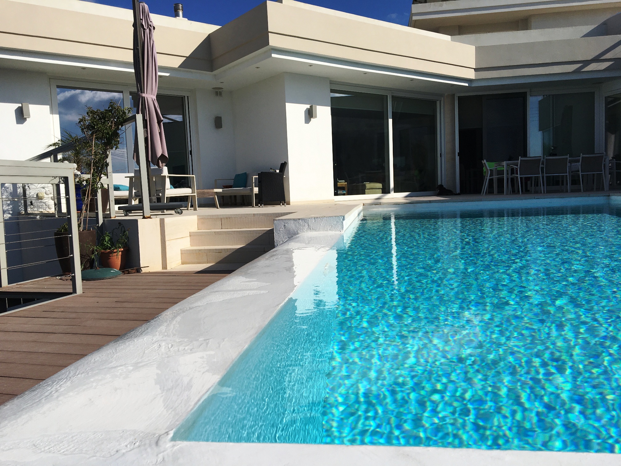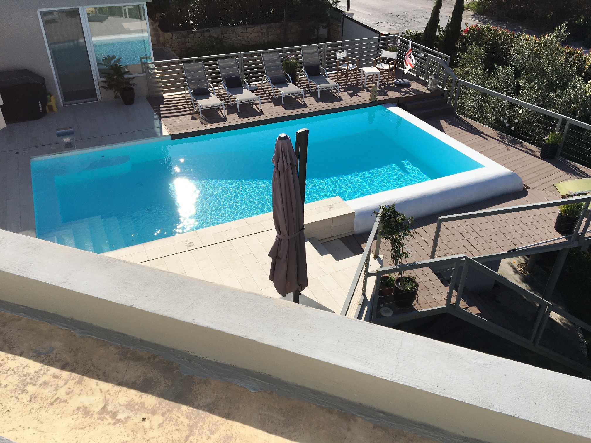 Der Außenpool bietet eine weite Aussicht und den ganzen Tag über Sonne, sowie spektakuläre Sonnenuntergänge. Das umliegende Deck verfügt über einen Ess-, Sofa-, Sonnen- und Grillbereich